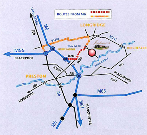 At M6 Junction 31a - follow the signs for the B6242 (6243) to Longridge. At the third roundabout, turn left for Longridge (B6243). Drive through Grimsargh. After the village, you pass a church and a school on the right. Turn right down the side of the White Bull Pub into Alston Lane, following signs for Alston Hall. Take your next left at the B&B sign and follow the road into our driveway leading to Jenkinsons Farmhouse Bed and Breakfast. Jenkinsons Farmhouse Bed and Breakfast, Alston, Longridge, |